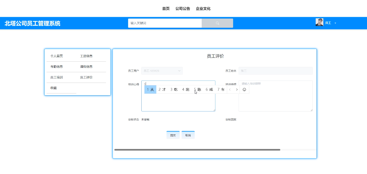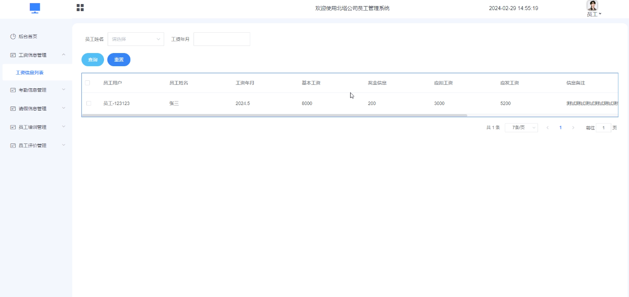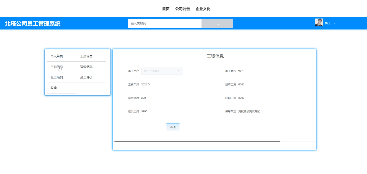 The system is developed using technologies such as SpringBoot, MySQL, and Java to add, modify, view, and delete system data. This system adopts a componentized approach to split the system, and analyzes and designs the addition, deletion, querying, and modification of various tables in the database, as well as the constraint relationships between tables. Ultimately, it achieves a commercial level application that meets user needs. This system realizes the computerized management of various workflow processes within the employee management system of Beita Company, including system user management for administrators, department classification management, salary information management, attendance information management, leave information management, employee training management, employee evaluation management, system management, announcement message management, resource management, and other functions.