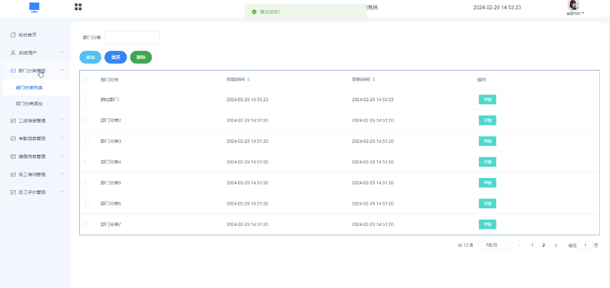管理员点击“部门分类”可以查看到所有的部门分类,可以对其进行增删改查操作。部门分类管理界面如下图4-12所示。