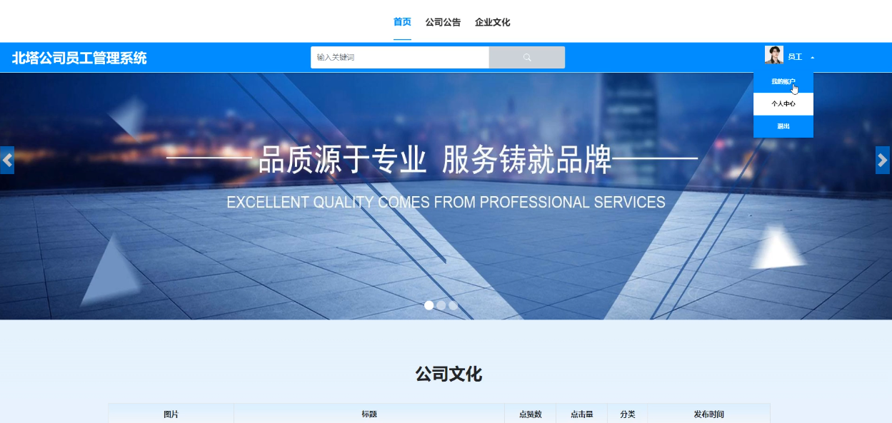 (2)查看北塔公司员工管理系统的首页信息:北塔公司员工管理系统的首页信息包含了首页、公司公告、企业文化、我的账户、个人中心等。