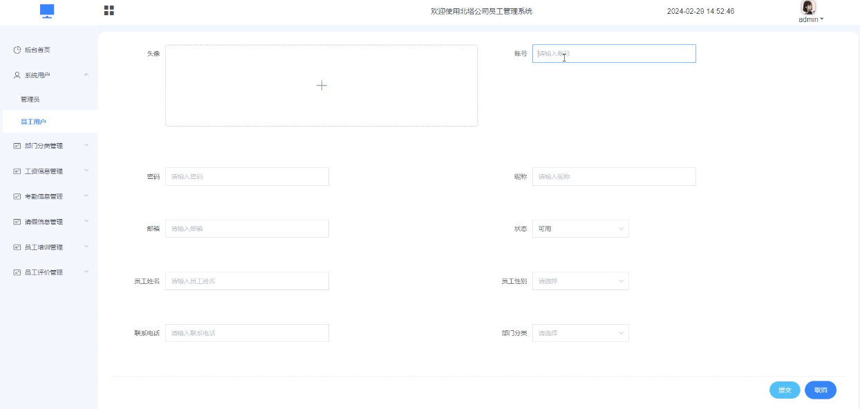 北塔公司员工管理系统我划分为了员工用户模块和管理员模块两大部分。
