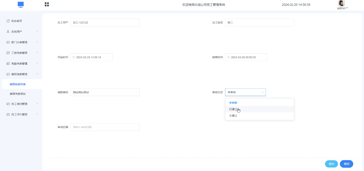 (6)请假信息管理:管理员点击“请假信息管理”可以对员工用户的请假信息进行审核回复。