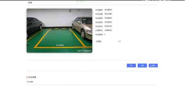 (4)车位信息:当用户点击“车位信息”这一菜单按钮,会显示管理员在后台发布的所有的车位信息,可以查看详情,进行停车、收藏、点赞、评论等;