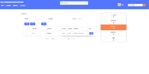 当用户点击下方导航栏“停车订单”这一菜单按钮,会显示所以相关信息,可以查看详情,进行填写提交等。界面如下图4-4所示。