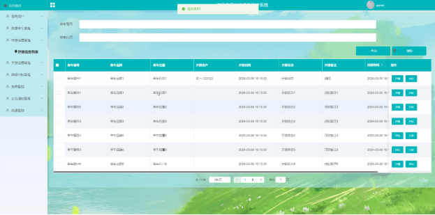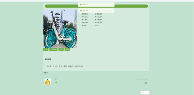 (4)共享单车:当用户点击“共享单车”这一菜单按钮,会显示管理员在后台发布的所有的共享单车,可以查看详情;可以进行开锁、申报维修、点赞、收藏、评论等操作。