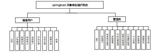 按照共享单车维护系统的角色,划分为了普通用户模块和管理员模块这两大部分。