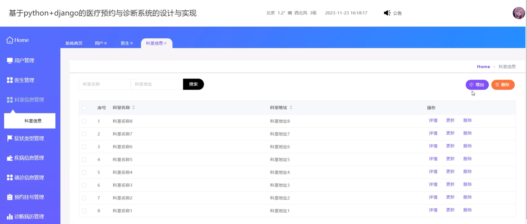 科室信息管理功能实现是在Django后端部分,您需要创建一个新的应用,然后在该应用下创建一个模型(models.py)来定义科室信息的数据结构,使用Django的ORM来处理与MySQL数据库的交互,包括科室信息的搜索、增加或删除等操作。接着,在views.py中编写视图逻辑来处理前端请求,使用Django的URL路由(urls.py)将请求映射到相应的视图函数。对于数据的验证和序列化,可以使用Django的表单或序列化器来实现。在前端Vue.js部分,将创建相应的Vue组件,在这些组件中使用axios或其他HTTP库与Django后端的API进行交互,实现科室信息详情的展示、更新科室信息和删除科室信息等功能。状态管理可以通过Vuex来维护,比如在store目录下定义科室信息模块的状态、突变、动作和获取器。科室信息管理界面如图5-10所示