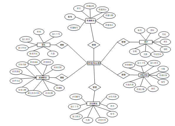 将“充值信息、医生、在线咨询、疾病信息、用户、评价信息”等作为实体,它们的局部E-R图,如图4-3所示: