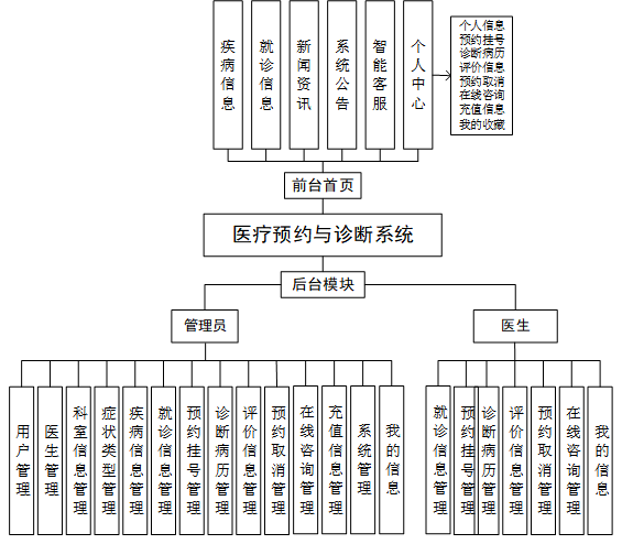 系统整体模块分为管理员、医生和用户三大用户角色,整体功能设计图如下所示:
