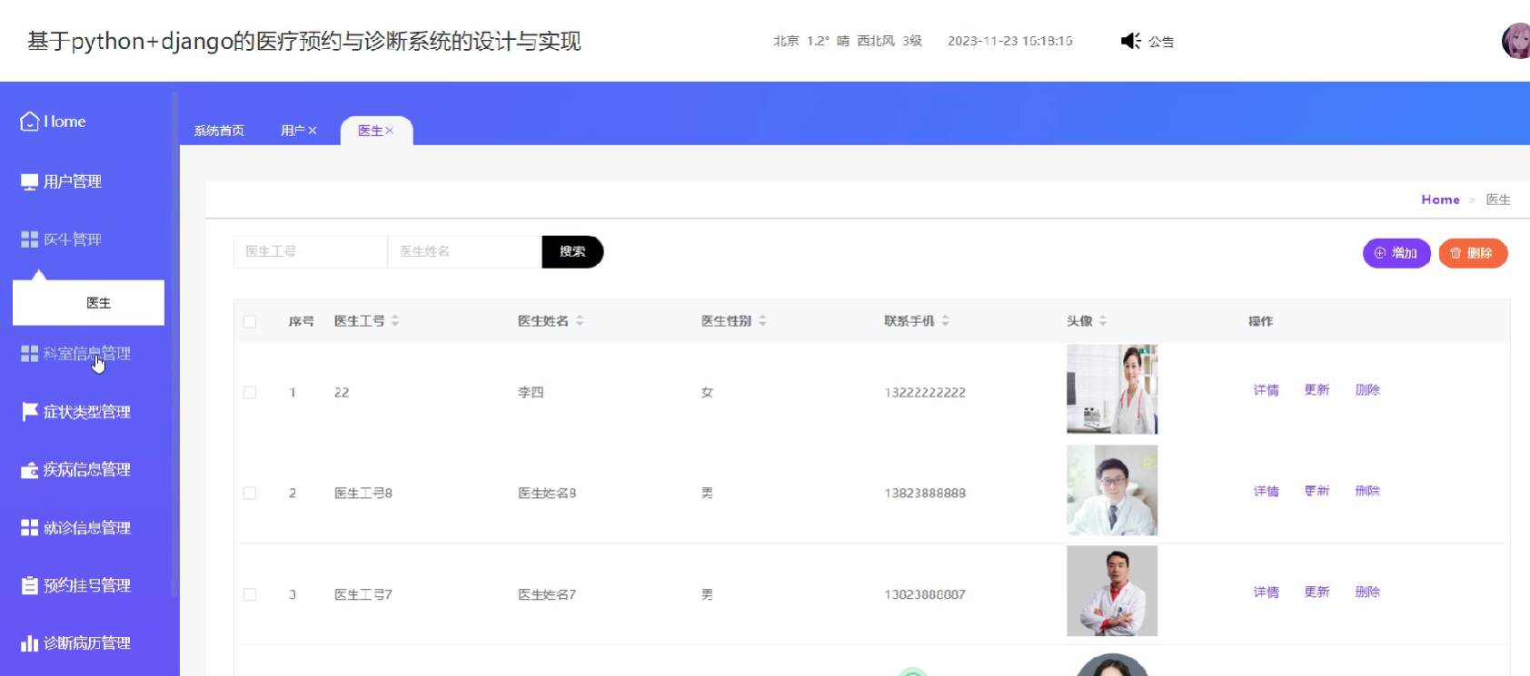 医生管理功能实现是在Django后端部分,您需要创建一个新的应用,然后在该应用下创建一个模型(models.py)来定义医生的数据结构,使用Django的ORM来处理与MySQL数据库的交互,包括医生信息的搜索、增加或删除等操作。接着,在views.py中编写视图逻辑来处理前端请求,使用Django的URL路由(urls.py)将请求映射到相应的视图函数。对于数据的验证和序列化,可以使用Django的表单或序列化器来实现。在前端Vue.js部分,将创建相应的Vue组件,在这些组件中使用axios或其他HTTP库与Django后端的API进行交互,实现医生详情的展示、更新医生和删除医生等功能。状态管理可以通过Vuex来维护,比如在store目录下定义医生模块的状态、突变、动作和获取器。医生管理界面如图5-9所示