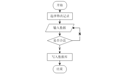 管理人员或者其他用户找到需要修改的信息后,然后将要修改的数据对应的输入到修改框里面。当数据合法的时候,则提示信息为添加成功。这时候这条数据就会被添加到了数据对应的数据库表中。如果不合法,则提示信息为添加失败,这就要重新把数据在输入一次来验证。修改信息流程图如图3-6所示。