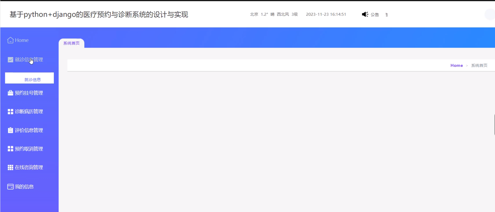 With the increasing scarcity of medical resources, the emergence of medical appointment and diagnosis systems has become the key to solving this problem. The system aims to improve the efficiency of medical services, reduce patient waiting time, and enable more reasonable allocation of medical resources. The system utilizes advanced information technology to achieve functions such as online patient appointments, doctor diagnosis, and real-time updates of examination results. Through this system, patients can conveniently and quickly make appointments for medical treatment, and doctors can diagnose more effectively, thereby improving the quality of the entire medical service.