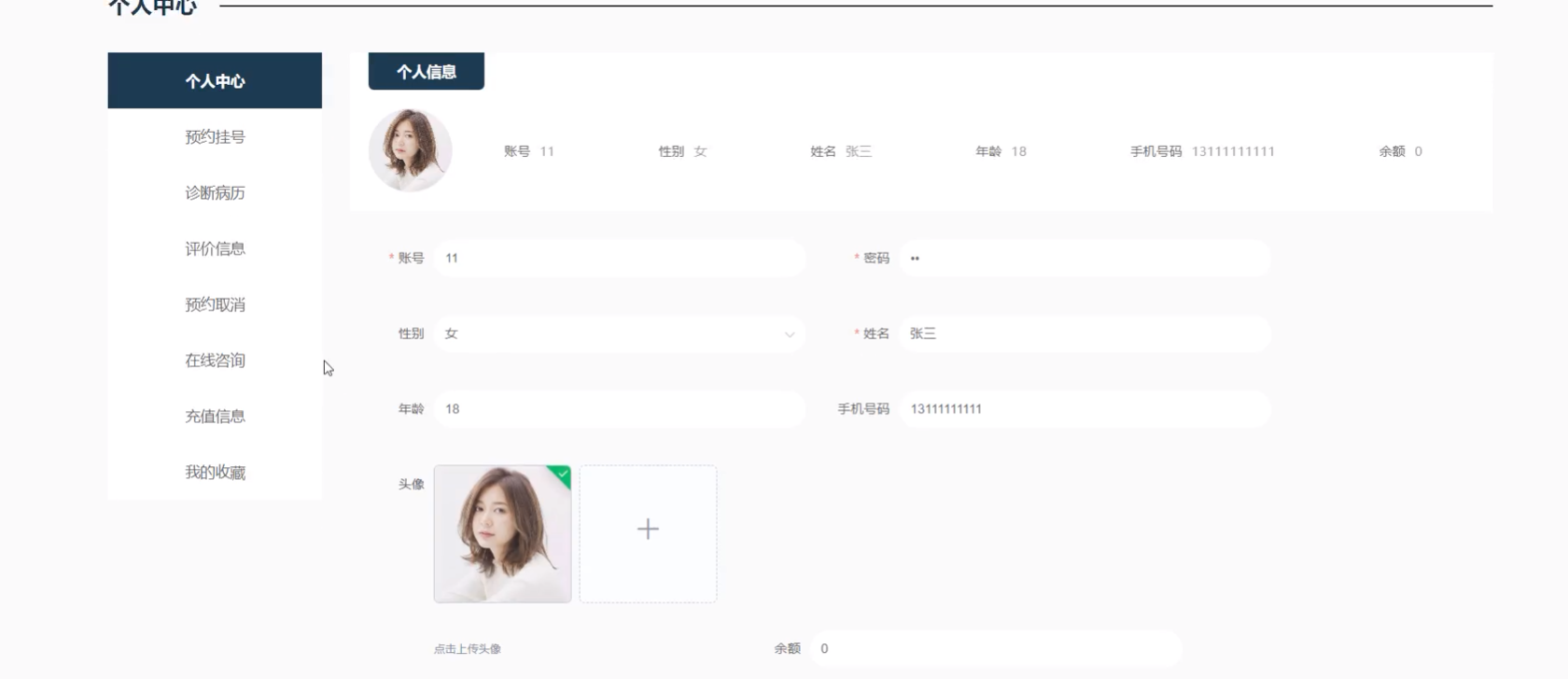个人中心:在个人中心页面可以对个人中心、预约挂号、诊断病历、评价信息、预约取消、在线咨询、充值信息、我的收藏进行详细操作;如图5-5所示: