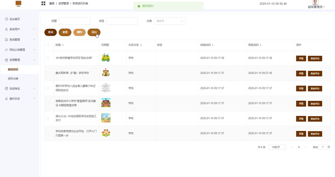 管理员可对新闻资讯、资讯分类进行管理,进行增删改查操作,新闻资讯支持标题、标签、分类搜索,可点击详情和查看评论进行查阅;资讯分类支持类型名称搜索。其界面如下图所示。