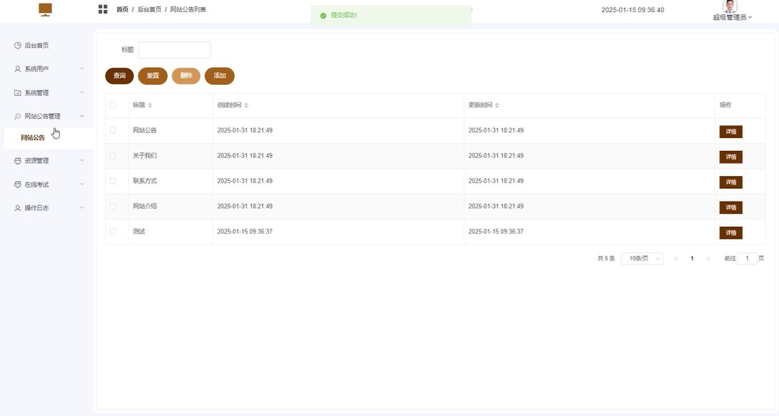 管理员可以在此发布和管理网站公告信息,包括添加新的网站公告、编辑现有公告等。系统支持网站公告的查询和统计功能,方便管理员了解公告的发布情况和效果。其界面如下图所示。