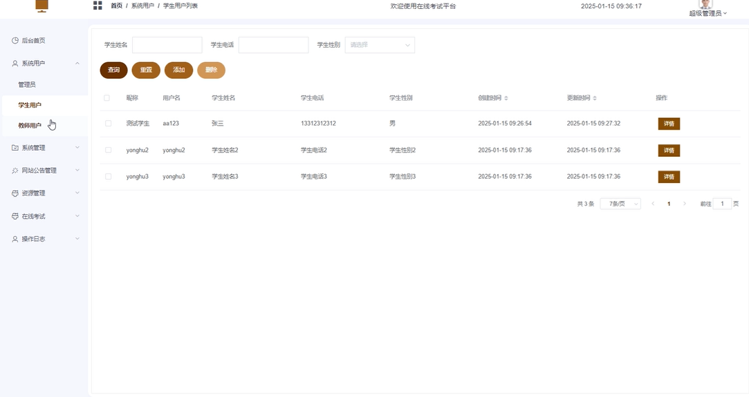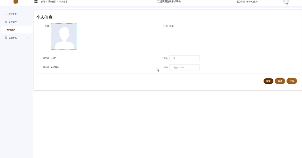 管理员在线考试功能允许管理员创建、发布及监控在线考试。可设定试题、时间限制、答案等,确保考试公正。实时追踪考生状态,防止作弊。考试结束后,自动收集答卷,快速生成成绩报告,便于管理员评估与反馈。其界面如下图所示。