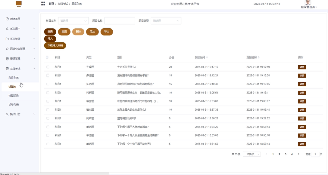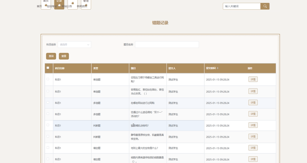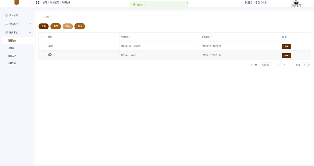 教师可在在线考试模块中管理科目列表、试题库、错题记录和试卷列表,实现考试的智能化管理和分析。其界面展示如下图所示。