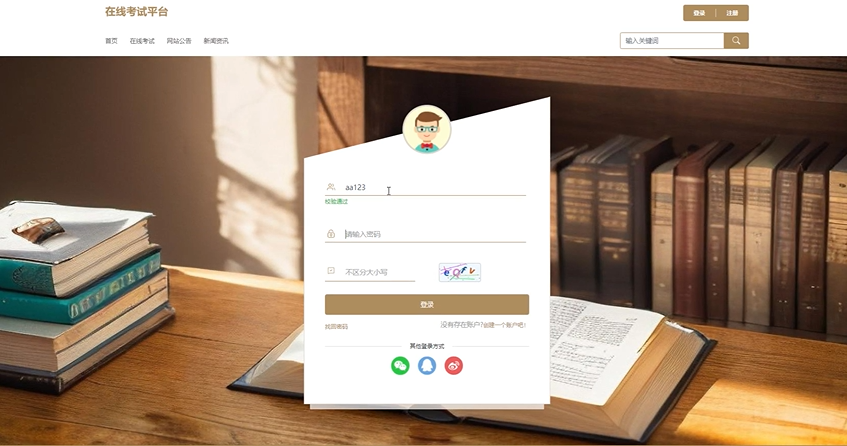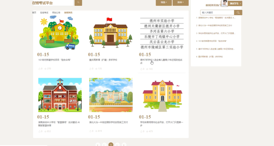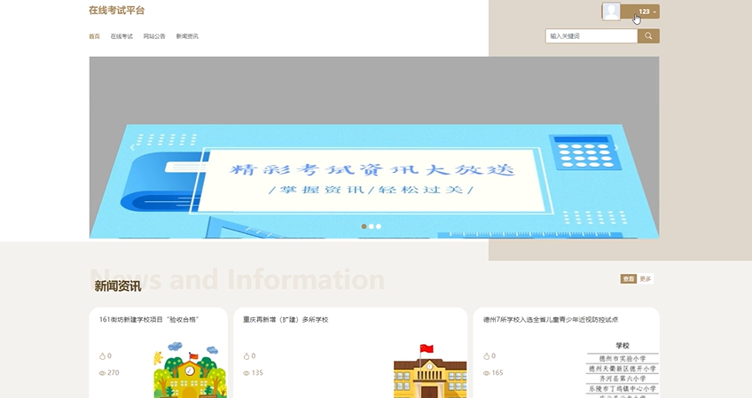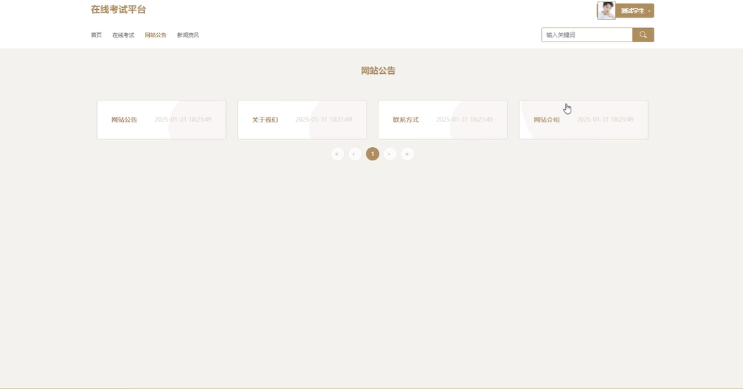 首页是平台的门户,展示在线考试、网站公告、新闻资讯等主要功能入口。设计简洁明了,方便学生快速找到所需功能,同时提供个性化推荐,根据学生的学习历史和兴趣推送相关内容。主界面展示如下图所示。