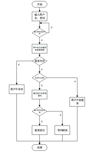用户输入用户名和密码后,系统先检查输入是否为空,再验证用户名是否存在,若存在则通过用户名获取密码并校验。若密码正确则登录成功,否则提示密码错误。若用户名不存在或无法登录,提示用户操作无效。如图4-1所示。