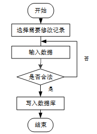 用户首先选择需要修改的记录,输入修改后的数据,系统判断输入数据是否合法。若数据不合法,提示重新输入;若数据合法,则将修改后的数据写入数据库,完成操作后流程结束。修改信息流程图如图4-3所示。