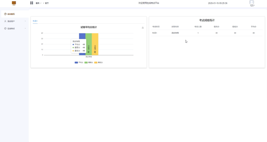 后台首页是教师管理平台的入口,展示教学管理的主要功能和统计信息。教师可在此查看学生考试情况、管理试题库、发布公告等。其主界面展示如下图所示。