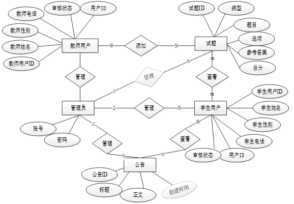 下面是整个在线考试平台中主要的数据库表总E-R实体关系图。