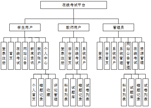 本系统的总体功能设计包括学生用户、教师用户和管理员三个角色的管理需求,旨在实现在线考试平台的高效管理与资源优化配置。对于学生用户,系统具备登录注册、首页、在线考试、网站公告、新闻资讯、我的账户、个人中心(个人首页、错题记录、收藏、评论管理)等功能。教师用户端则包括登录注册、后台首页、系统用户、在线考试(科目列表、试题库、错题记录、试卷列表)等功能。管理员则具备更为全面的管理功能,涵盖登录、后台首页、系统用户、系统管理、网站公告管理、资源管理、在线考试(科目列表、试题库、错题记录、试卷列表)、操作日志等功能。系统功能结构图如图3-1所示。
