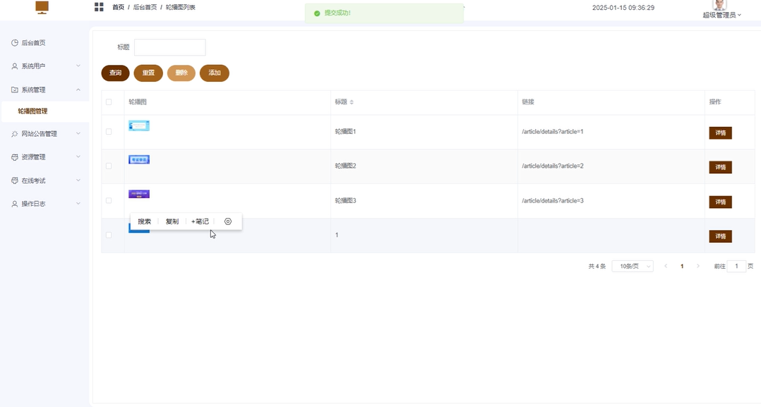 管理员可对前台首页的轮播图进行管理,进行增删改查操作。其界面如下图所示。