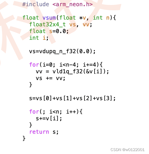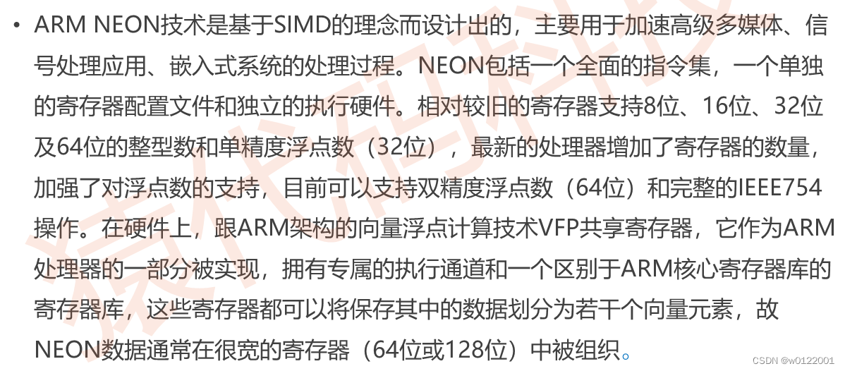 目录 一、简介 1.SIMD是什么? 2.为什么有向量指令? 3.ARM向量指令以及NEON技术 二、简单的向量化示例 三、ARMv8 NEON Intrinsic编程 总结 一、简介 1.SIMD是什么? 2.为什么有向量指令? 3.ARM向量指令以及NEON技术 二、简单的向量化示例 三、ARMv8 NEON Intrinsic编程 总结 例如:以上就是今天要讲的内容,本文仅仅简单介绍了SIMD的使用,以及ARM NEON Intrinsic 的网站各位感兴趣的可以了解一下。