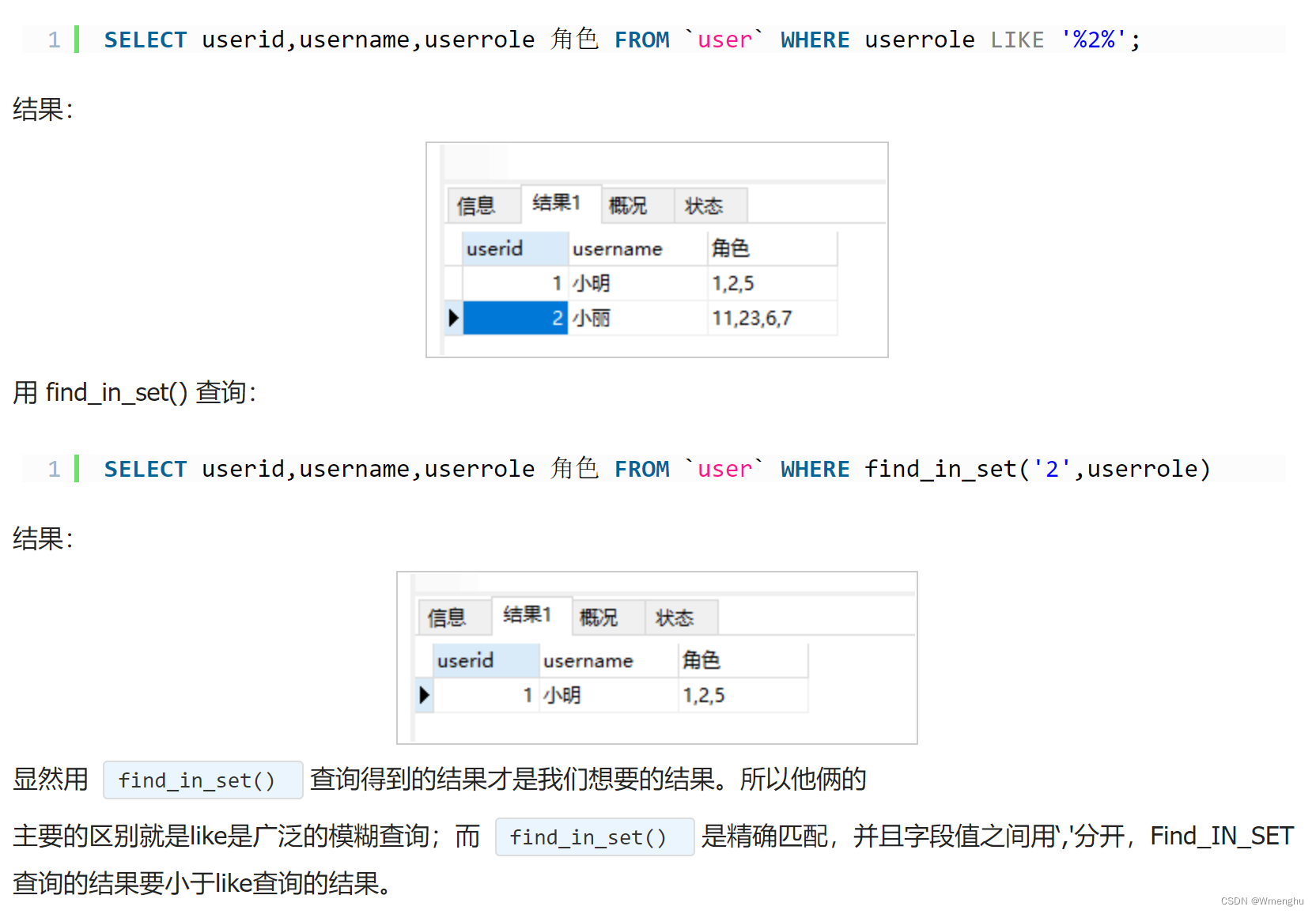 主要的区别就是like是广泛的模糊查询,而 find_in_set() 是精确匹配,并且字段值之间用‘,'分开。