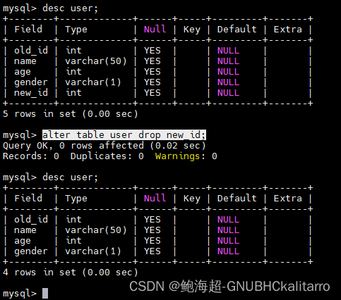 删除字段:alter table 表名 drop 指定的字段名;