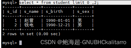 select * from student limit 0 ,2;