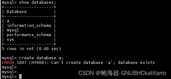 刚刚上面已经有了a数据库,再创建a数据库那就会报错