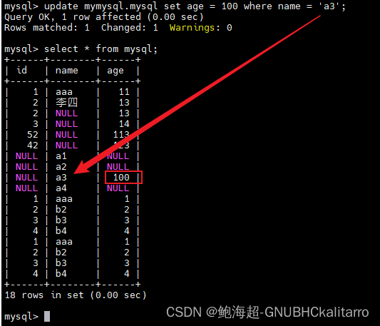 将表内指定的数据进行修改 ,如果没有where的话那么整个表内容被匹配上的内容,那就全被修改,如果有where只会去修改where匹配上的内容
