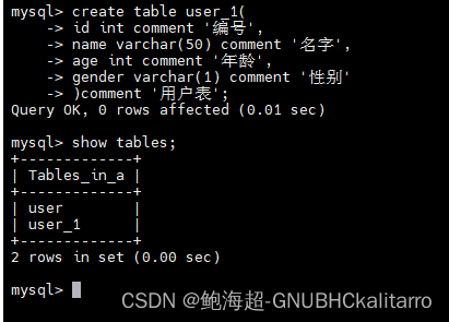 create table user_1( id int comment '编号', name varchar(50) comment '名字', age int comment '年龄', gender varchar(1) comment '性别' )comment '用户表';这样写也是可以的,这样写和上面那样是一个样子,只不过下面这个可读性更高,更易理解