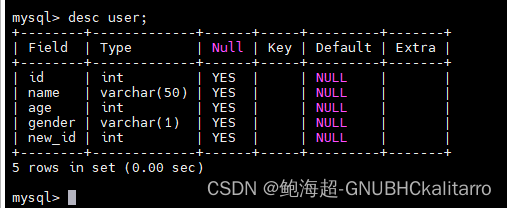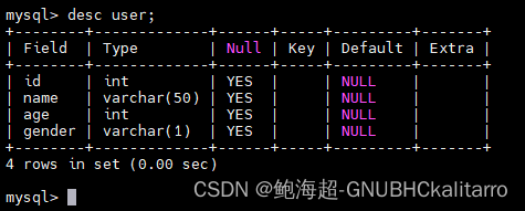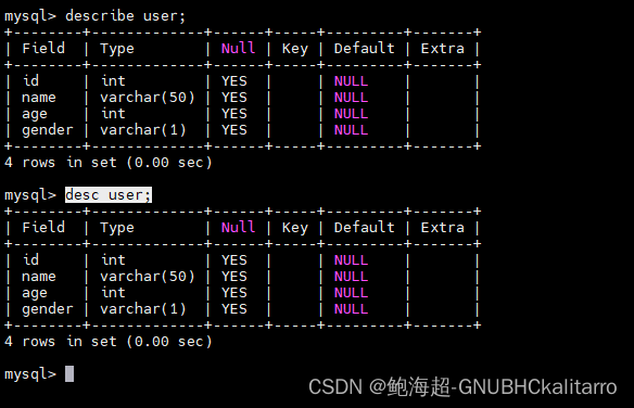 查看表结构:describe 表名; 或者 desc 表名; 这俩都是一样的