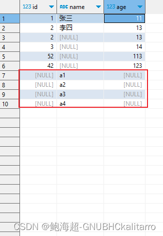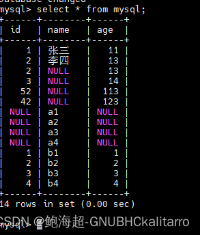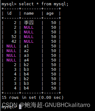 INSERT INTO mymysql.mysql(id,age) values(2,13),(3,14),(52,113),(42,123);意思是给id和age的字段插入多行内容那么name没有对应的那就是null空的