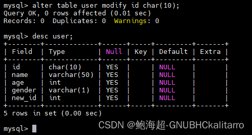 alter table user modify id char(10);