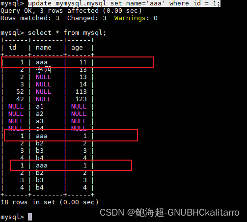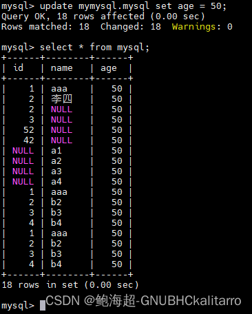 INSERT INTO mymysql.mysql(name) values("a1"),("a2"),("a3"),("a4");再给对应name的字段插入多个内容那他的其他字段内容就是空