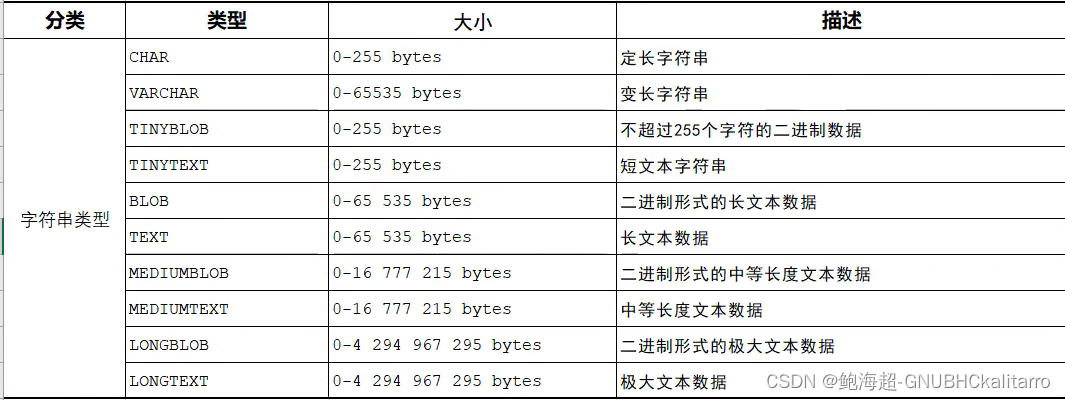 字符串类型前两个比较常用,定长字符串意思是你定义了10个的长度他就占用10个如果你没写够10个那么他会用空格填补,如果是varchar的话,你虽然定义了10个但是你写了2个字符,他就占用2个字符,这样的对比下char的性能最好,varchar没有char性能好,因为char不需要去计算空间占用,你给多少就是多少。