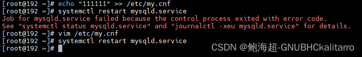让他检查上之后就先不要管,再切换回第一个终端中,随便改一下mysql的配置文件,再去重启mysqld服务