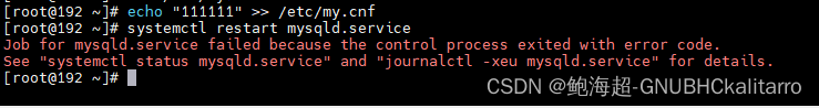 这里我们往mysql的配置文件中加点字符,模拟他配置文件出错的效果