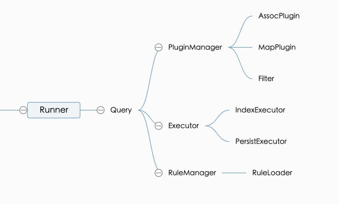 2)Query,是整个内部流程的控制中心,负责根据Runner传入的参数,进行SQL的拼装、DB的读取、Executor和Plugin的调度等。不同的索引方式,需要对SQL进行不同的预处理,类似时间增量需要维护增量的时间等,也在该模块内完成。