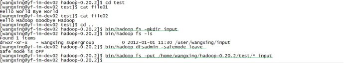 12.将文本文件放入hdfs分布式文件系统中:bin/hadoop fs -put /home/wangxing/hadoop-0.20.2/test/* input