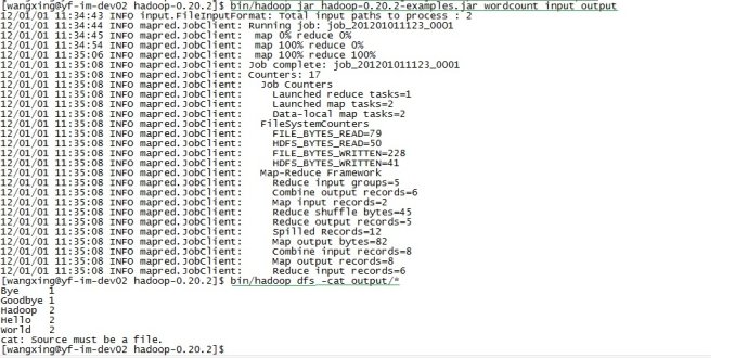 13.执行例子中的WordCount:bin/hadoop jar hadoop-0.20.2-examples.jar wordcount input output