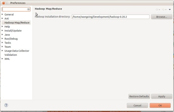 如果安装插件成功,打开Window-->Preferens,你会发现Hadoop Map/Reduce选项,在这个选项里你需要配置Hadoop installation directory。配置完成后退出。