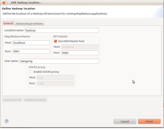 在Window-->Show View中打开Map/Reduce Locations,在Map/Reduce Locations中新建一个Hadoop Location。在这个View中,右键-->New Hadoop Location。在弹出的对话框中你需要配置Location name,如Hadoop,还有Map/Reduce Master和DFS Master。这里面的Host、Port分别为你在mapred-site.xml、core-site.xml中配置的地址及端口。(见1.4的代码)如: