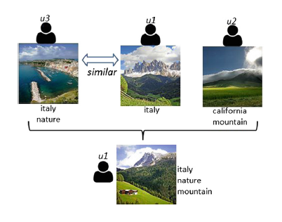 U1的推荐标签包含他喜爱的单词italy,和图片内容相关的单词mountain,来自u3的单词nature,u3和u1相似。