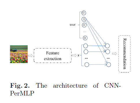 模型叫做CNN-PerMLP,其结构是基于给定图片的用户和视觉特征的关系,如上图2.把图片i的片段q送入CNN特征提取器来获得视觉特征。为了使视觉特征个性化,个性化全连接层是从下面的提取器获得的。这层捕获用户和每个视觉特征的交互,产生post pu,i的隐式特征。
