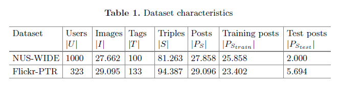 我们对用户使用leave-one-post-out去分割数据集。对于每个用户,随机选择Flickr-PTR posts和2 NUS-WIDE posts的20%来当测试集,这个子数据集可以用表1来描述。