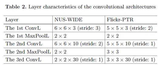 网格搜索策略被用于寻找最佳学习率α,其中ConvLs层的学习率是{0.001, 0.0001, 0.00001},全连接层的学习率是{0.01, 0.0001, 0.0001},最佳的L2正则λ的范围为λ∈{0.0,0.0001,0.00001},momentum的值μ固定为0.9。 64维的颜色直方图(CH)和225维块级别的颜色矩(CM55),这是NUS-WIDE作者提供的,Flickr-PTR图片的64维颜色直方图(CH)用来做比较实验。